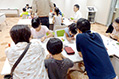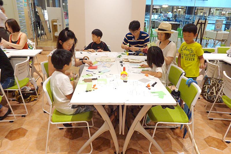 テーブルを4つの島にすることで、知らない人ともわいわい話しながら工作ができるように配置。