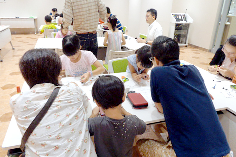 夏休みの子ども向け企画。ペーパークラフト作家の先生が、小学生のお子様に紙のてんとう虫の作り方を教えました。