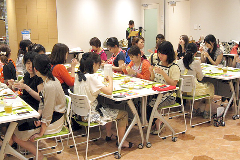 ハワイをテーマにした大人向けの料理教室。Room2のキッチンと調理台を使って、4人グループで協力し合い料理を作りました。