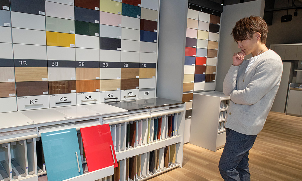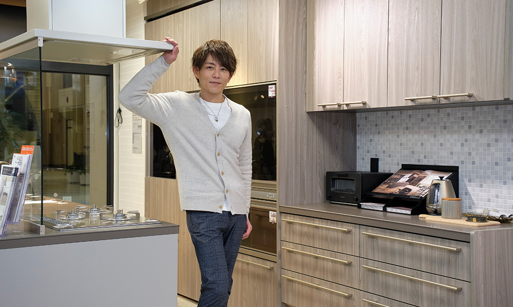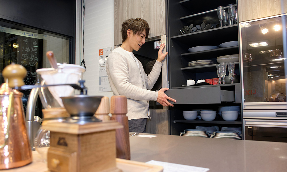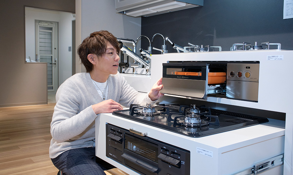 料理はよくします。僕は釣りをするので、釣ってきた魚を自分で捌きます。ショールームなどでキッチンを見る時は、まな板はこの辺に立てかけて、だいたいここでウロコを落として、と使い勝手をイメージしてみます。魚を捌くにはシンクは広い方がありがたいです。