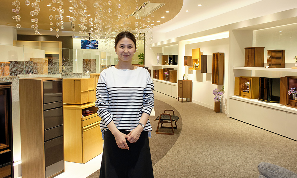 わたし自身、姉妹の長女なので自分ごとでもあるんです。ギャラリーメモリアではいろいろなタイプの仏壇を見せてもらいました。リビングに置いて違和感のない家具のようなデザイン、壁面に付けるコンパクトな形状など、今の暮らしに合わせた新しい仏壇のカタチにびっくり。どれもインテリアの一つとしてデザインされているので、わたしたち世代の暮らしにも取り入れやすいのでは、と思いました。