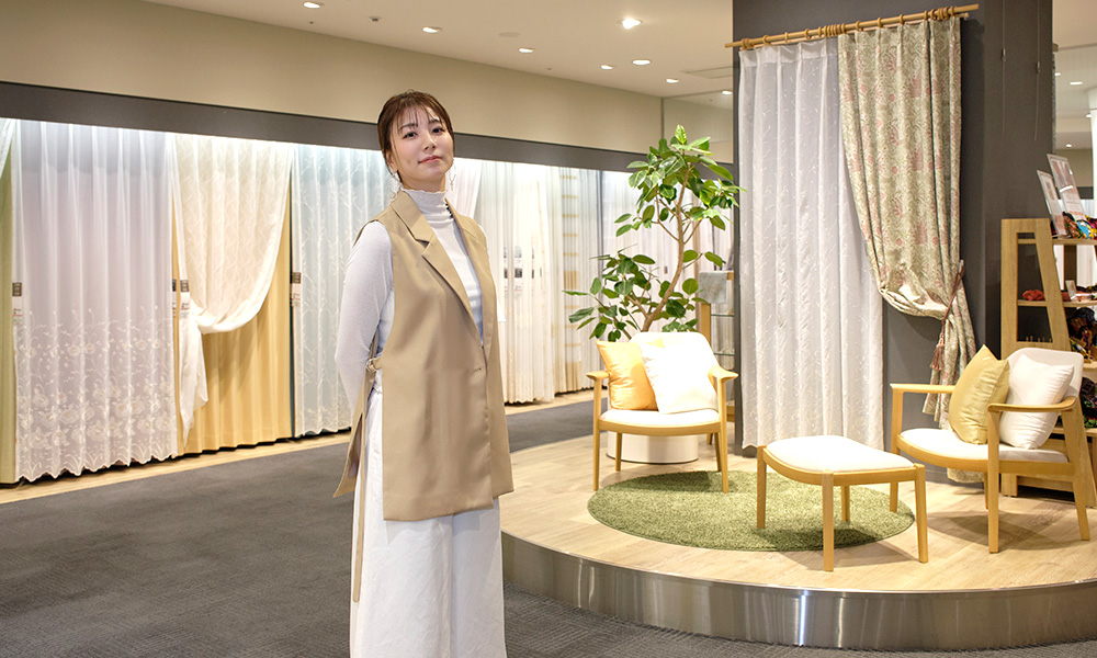 ジャストカーテンにはたくさんのカーテンが揃っていますね。カーテンを選ぶポイントは、遮光性があること、部屋が広く見えること。派手な柄物は避けて、色もベーシックな方がいいですね。ベージュならうっすら柄があるもの、グレーは薄い色のものが好きです。店内にはわたし好みの色に限ってみてもかなりの数があって、今すぐカーテンを替える予定はないのに、見ているうちにどれがいいか本気で悩んでしまいました。カーテンを替えるときは時間をたっぷりとって見に来たいですね。