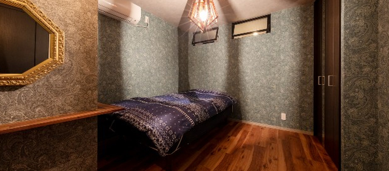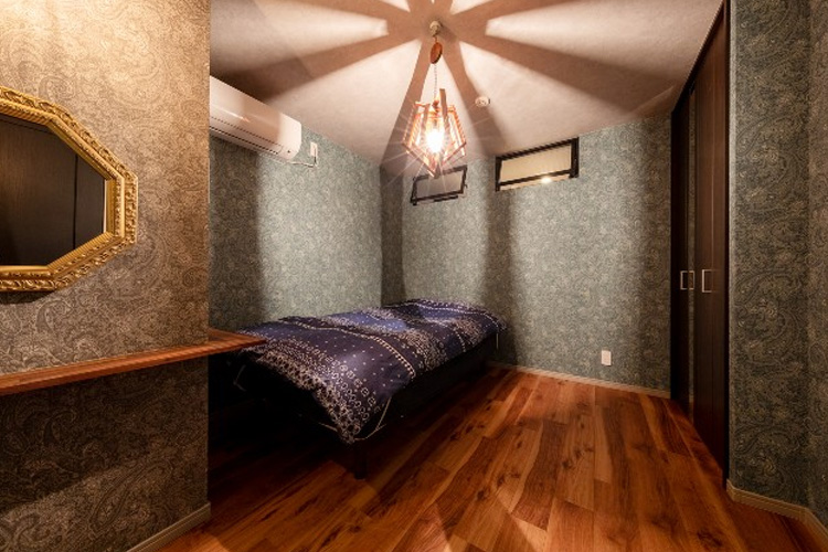 はい。ゲストルームはホテルのような部屋にしたいとのご希望でした。そうなると、コンクリートとは別のイメージにしたほうがいいのではないかと思い、エレガントな雰囲気のペイズリー柄を提案させていただきました。施主様から提供いただいたクラシカルなミラーに合わせて棚板もつくっています。