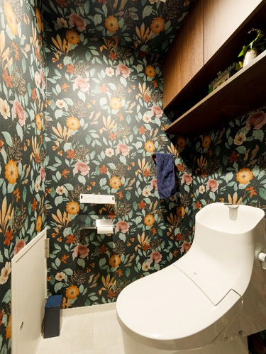 トイレの壁紙も個性的な花柄模様ですね。随所に施主様のこだわりがうかがえます。