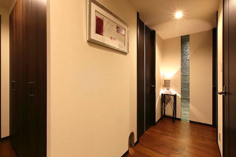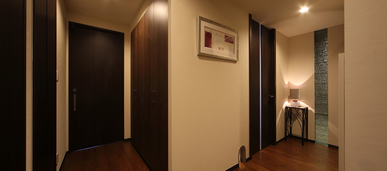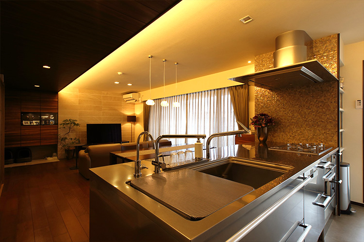 施主様は仕事が忙しく、家ではゆっくりとくつろぎたいと感じておられました。そこで間接照明を取り入れたり、家具も海外製のラグジュアリーのあるものを選んだりしたことで、落ち着いた空間に仕上がったと思います。施主様にも、とても快適だと満足していただいています。