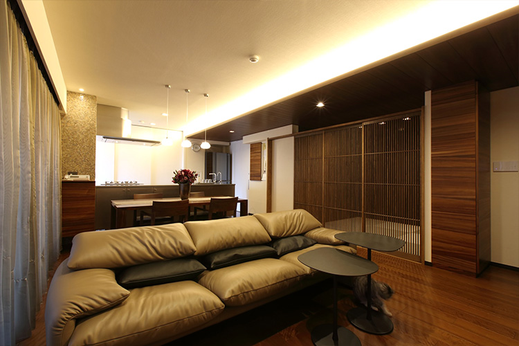 和室からLDKの一部は天井が下がっています。そして天井に間接照明を入れていますね。一体感があって素敵な空間だなと思いました。このアイデアはどこから生まれたのでしょうか?