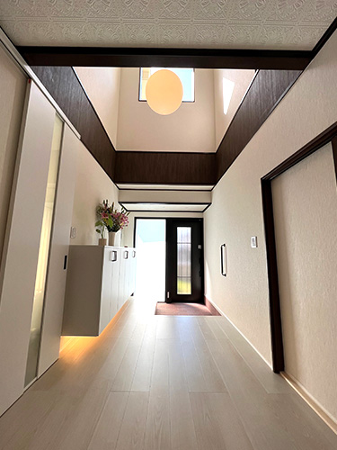 玄関は吹き抜けでも十分明るいのですが、フロートタイプの靴箱の下に照明を入れています。上からもペンダントライトを吊るして、雰囲気を出しました。