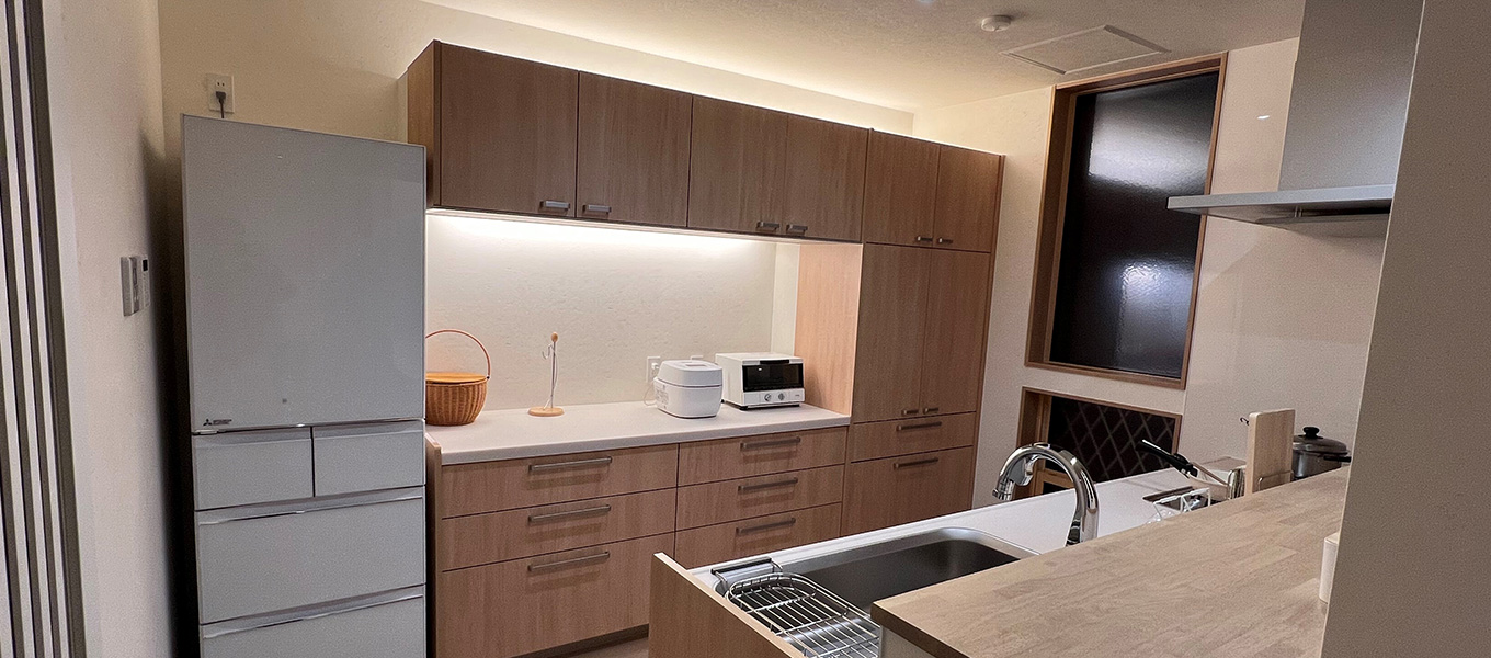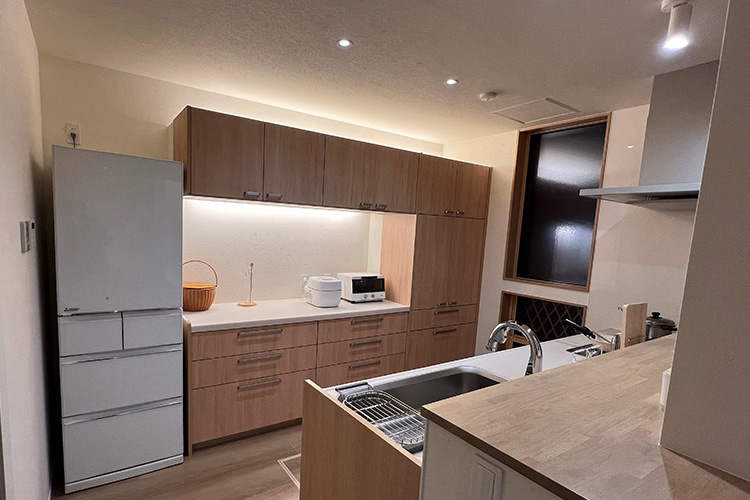 キッチン背面の収納棚の上部にも間接照明を設置