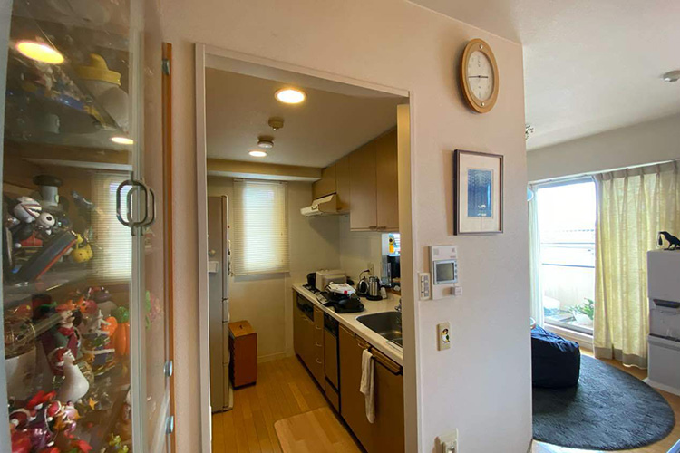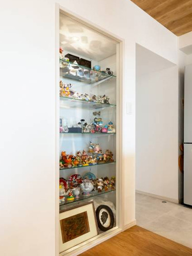 あとは飾り物のコレクションをたくさんお持ちだったので、キッチンの横のスペースをガラス張りのショーケースにしました。扉はフリースペースの手前に取り付けて、横からコレクションを並べられるようにしています。