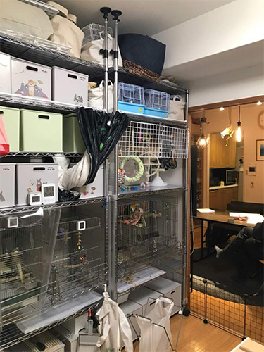 和室をなくしてリビングに取り込んだことで、ペットの鳥たちのスペースができました。キッチンからもよく見えます。