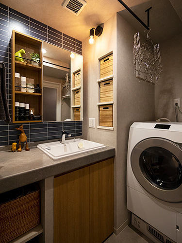 水回りは造作です。機能面はそのままでデザインにこだわりました。ニッチもつくって、おしゃれな収納にしています。