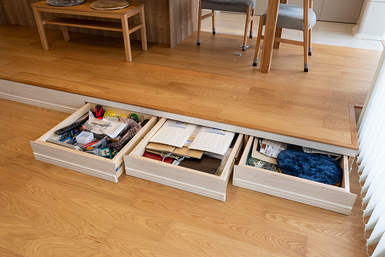 また、キッチンの小上がりに引き出しを3つ設置しています。リビング側に生活用品を収納する棚がないように見えますが、小上がりに収納スペースが確保できているんです。