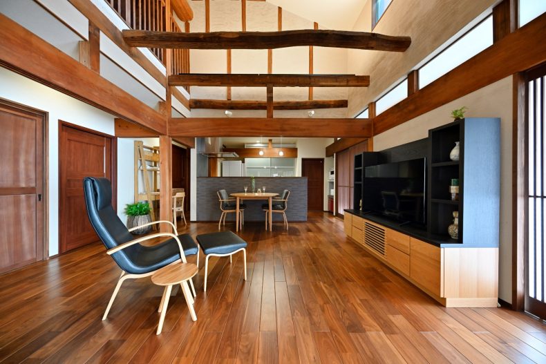 建物種別 一戸建て リフォーム箇所 全面、キッチン、浴室、洗面化粧室、トイレ、リビング・ダイニング、寝室・居室、玄関、外壁・門まわり 工期 7か月 実家の古民家を子世帯が新しい住まいへリノベーションしました。モダンと古民家の木材を活かした空間へ