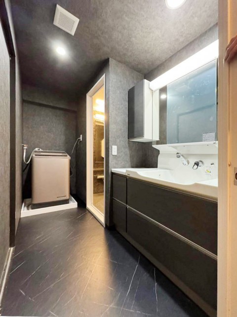 建物種別 マンション リフォーム箇所 洗面化粧室 リフォーム価格 49万円 工期 2日間 全体的にブラックでコーディネートした内装に。天井にある照明が複数あるため暗すぎず、ホテルライクな雰囲気になりました。