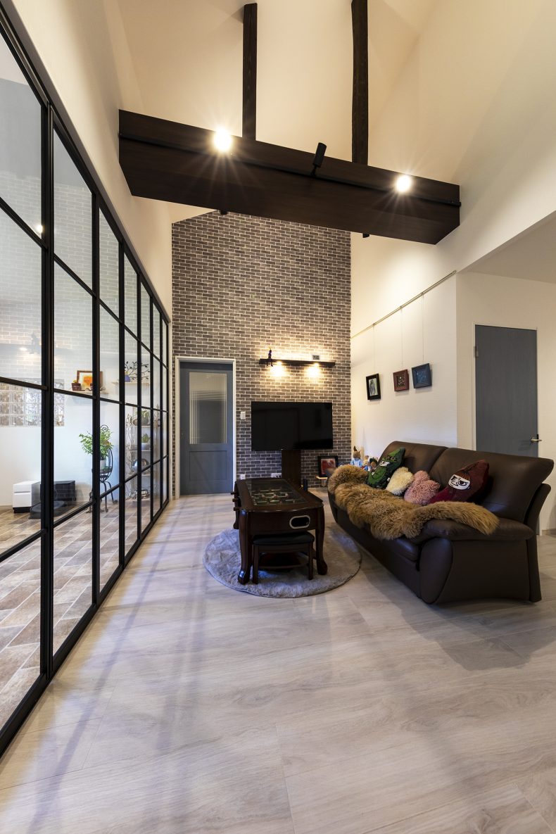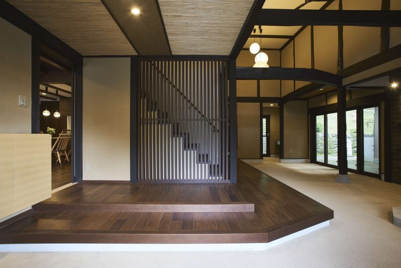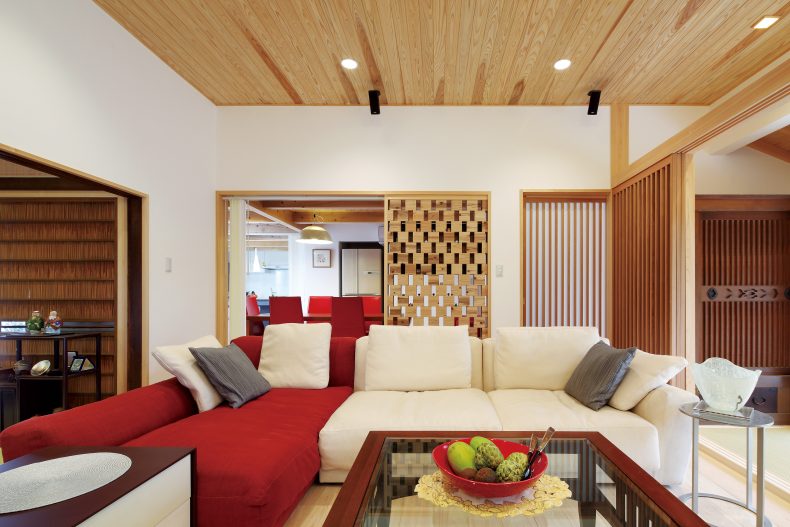 一部に畳を敷いたフローリングやダイニングとキッチンカウンターを仕切る格子が魅力的。和のあしらいと北欧テイストのインテリアが溶け合うジャパンディスタイルの住まい。