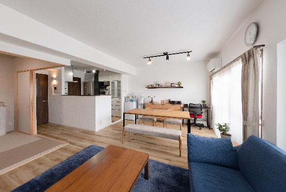 建物種別 マンション リフォーム箇所 全面、キッチン、洗面化粧室、トイレ、リビング・ダイニング、寝室・居室、玄関、その他 リフォーム価格 1200万円 工期 82日 スケルトンリフォーム。ご家族が帰省時も集まれる空間ができ、水廻りも広く使いやすい動線になりました。キッチンから、明るくなったLDKやお孫さんの様子も見渡せます。
