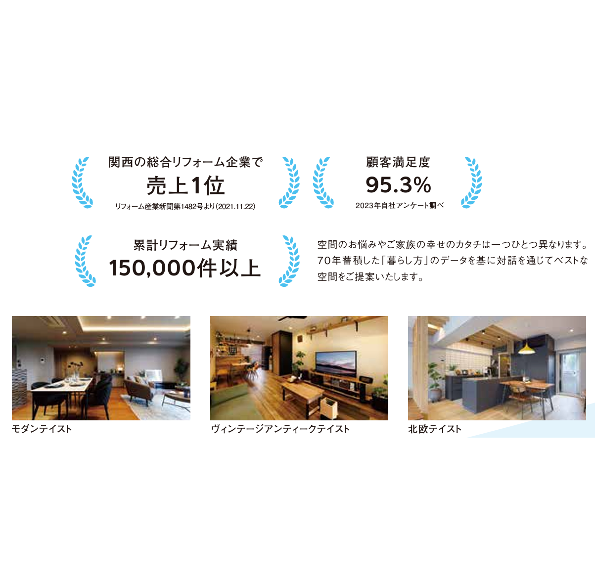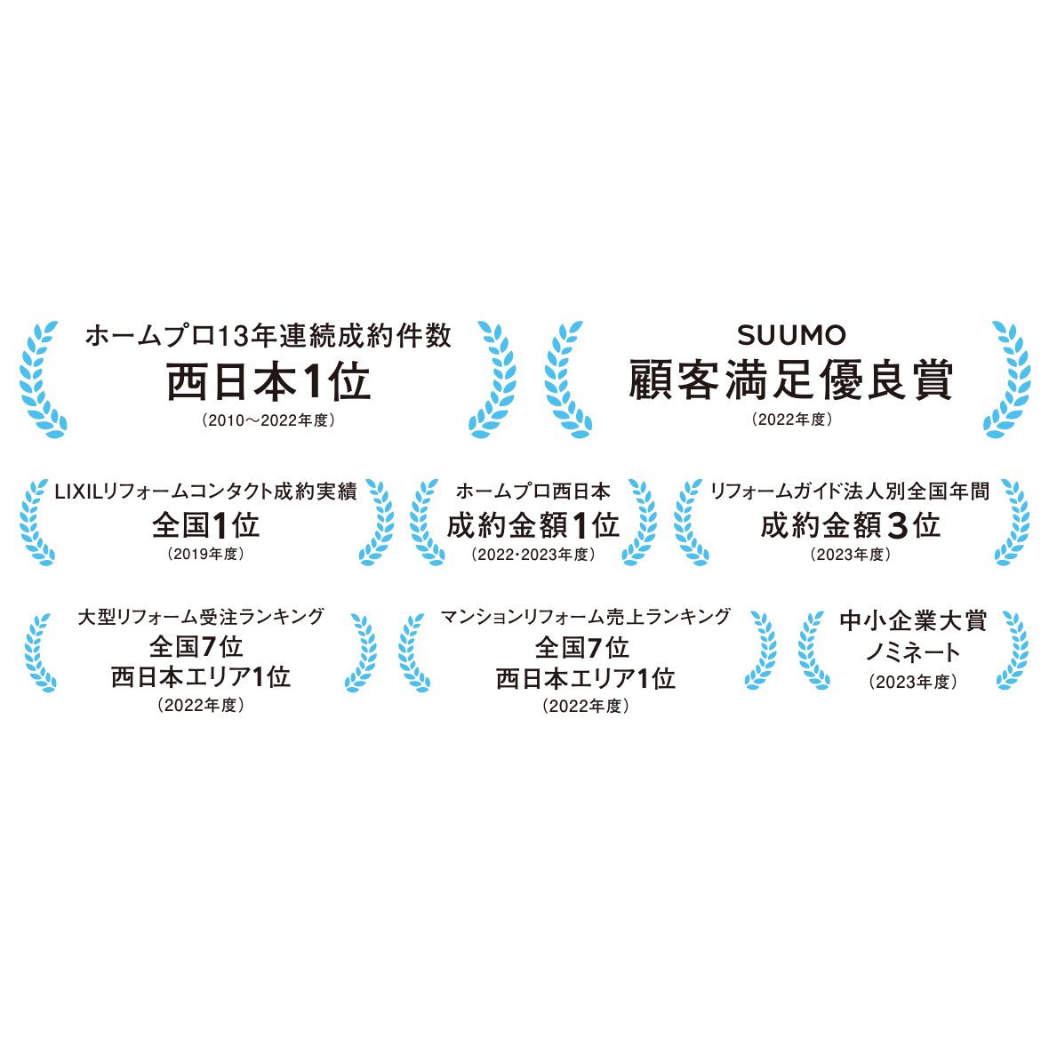 リフォームにまつわる様々なランキングで上位入賞。リフォーム専門会社として累計15万件の様々な案件で積み重ねた実績とノウハウが安心感へとつながっています。