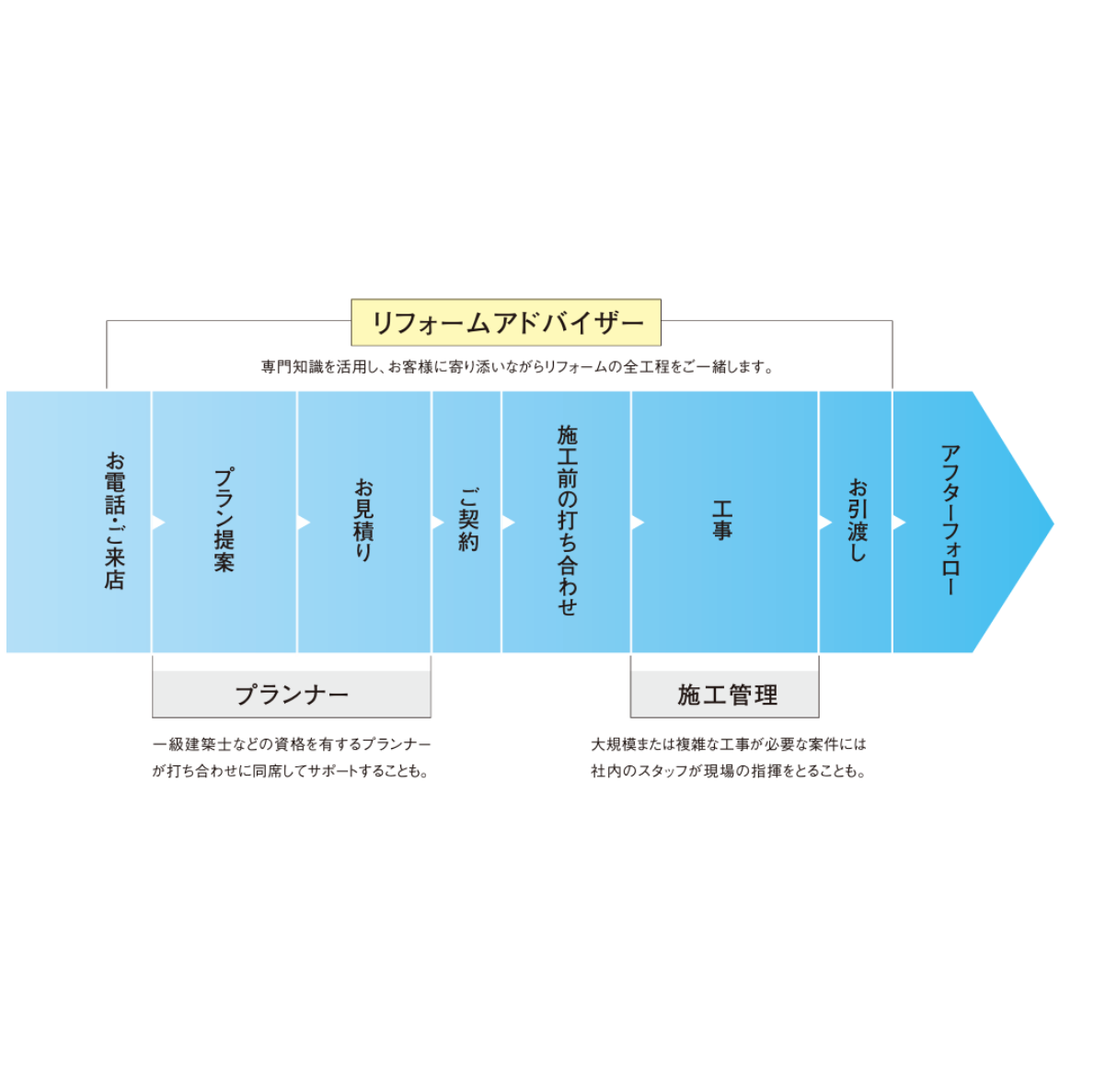 リフォームアドバイザーがお客様に寄り添い、ご相談から施工、お引き渡しまですべての工程をワンストップでサポートします。