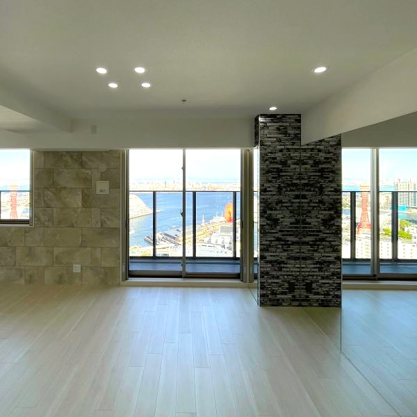 ポートタワーを部屋のあらゆる場所から様々な角度で眺めたいというご要望にお応えし、壁面にミラーを取り付けました。この撮り方ではポートタワーが2つに見えますね。