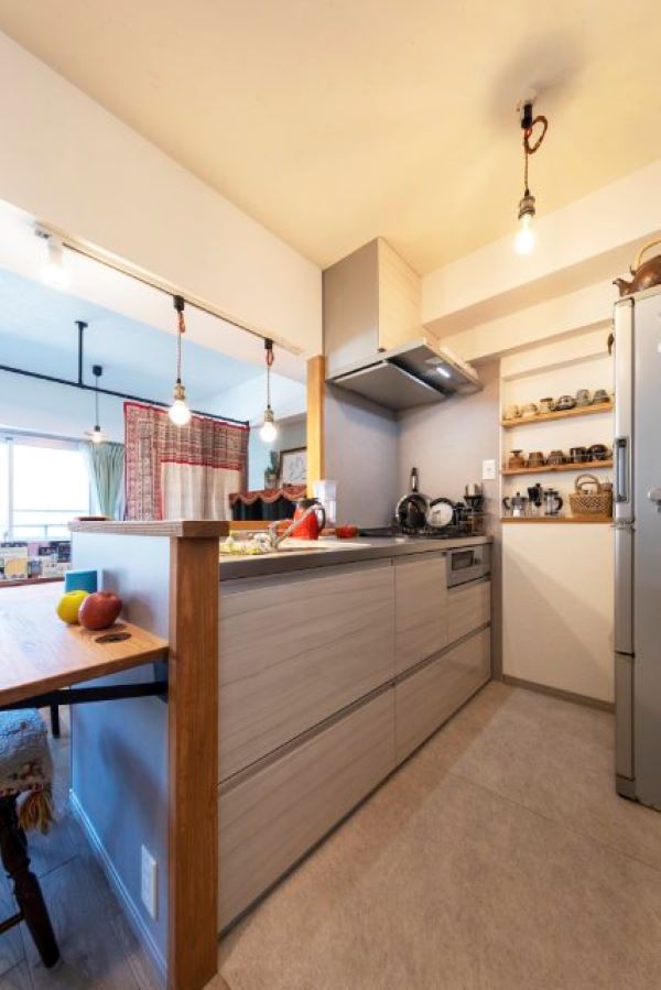 横並びのキッチンで配膳が片付けも楽々。ダイニングテーブルは造作でキッチンに据付けました。キッチンの段差部分には引き出しスペースを設計しました。
