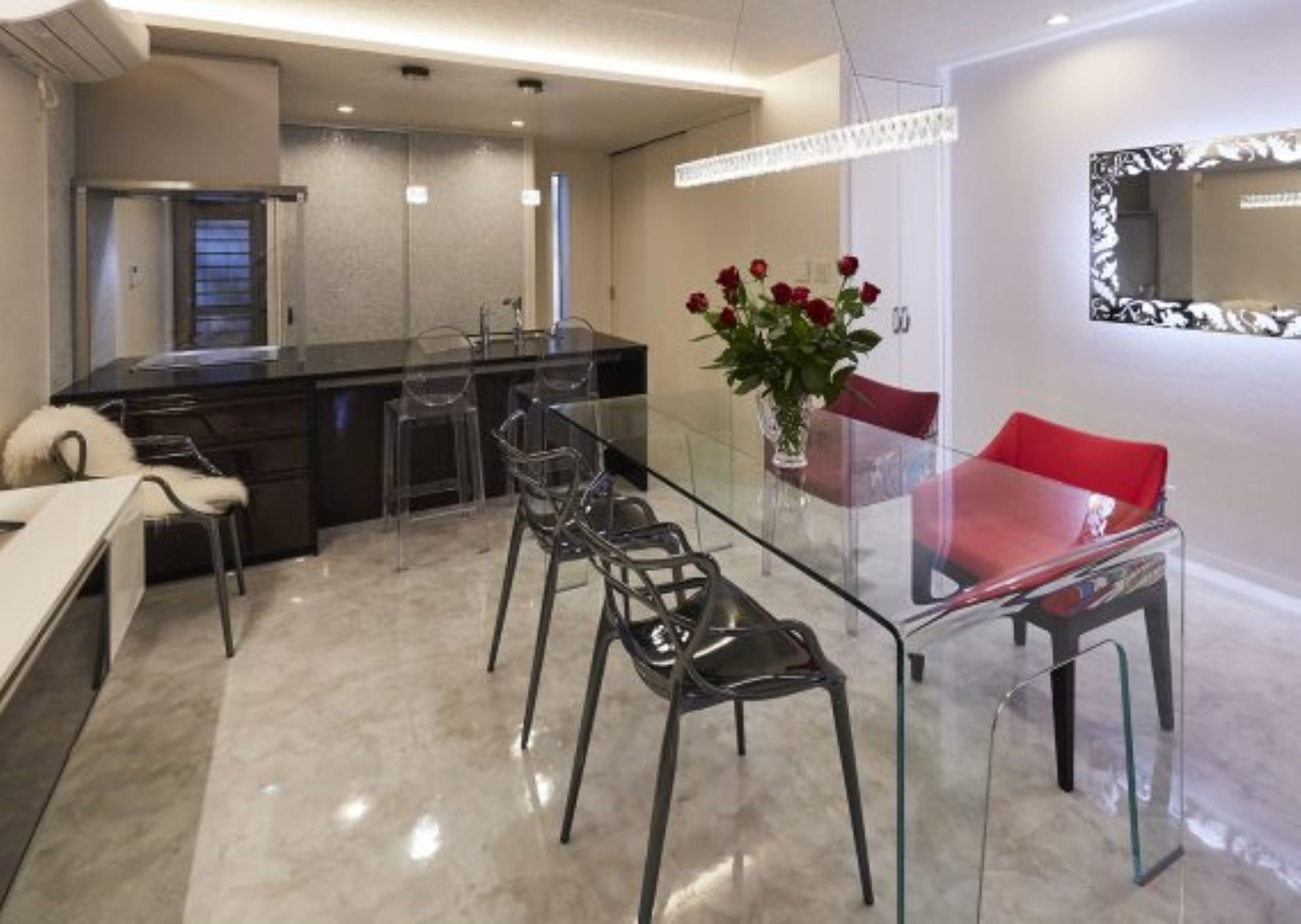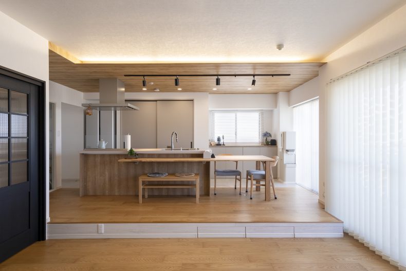 横並びのキッチンで配膳が片付けも楽々。ダイニングテーブルは造作でキッチンに据付けました。キッチンの段差部分には引き出しスペースを設計しました。