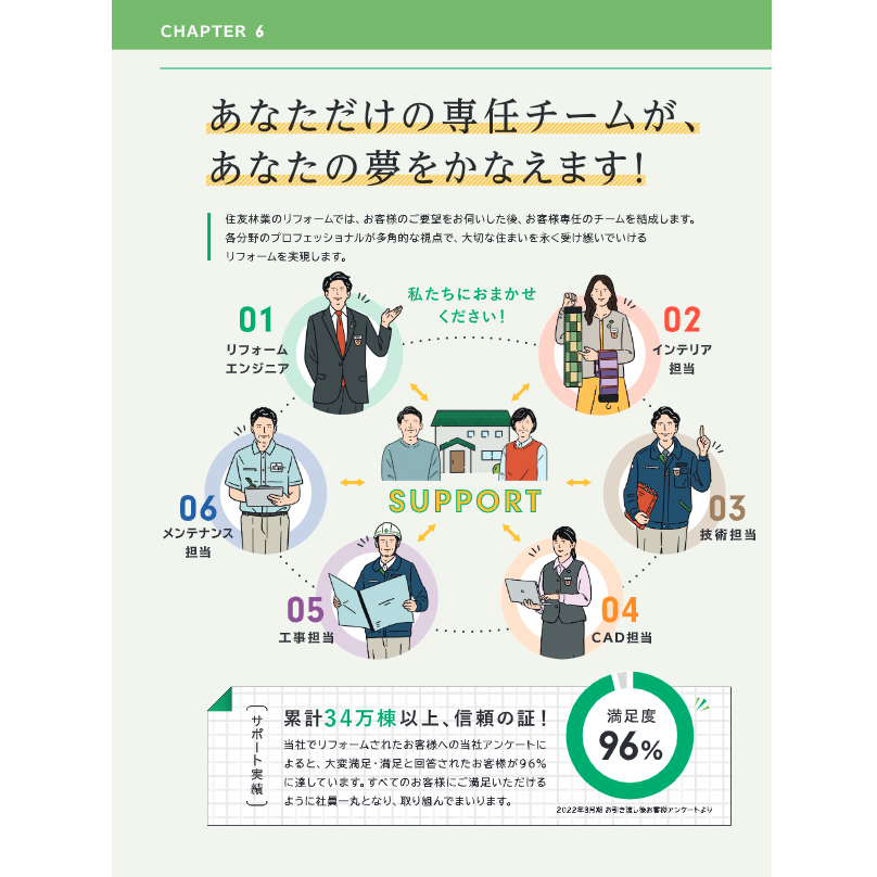 リフォームエンジニア、インテリア担当、技術担当、CAD、工事担当、メンテナンス担当からなる各分野のプロフェッショナルがサポートいたします。
