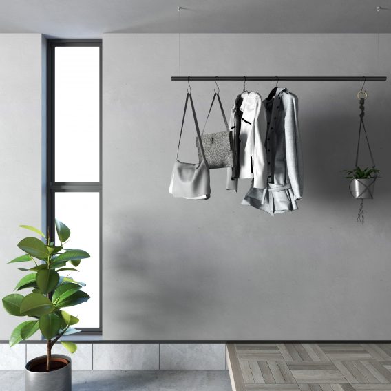 存在を主張しない、シンプルなハンガーバー。ワイヤー吊りで、まるでバーが宙に浮いているかのような「浮遊感」が魅力です。ランドリースペースの室内物干しや玄関収納、リビングなど自由に空間を演出できます。