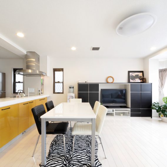 モノトーン基調のインテリアに、奥様が一目ぼれしたマスタードイエローのキッチンが映えます。お母さんの溢れる笑顔が、家族の皆さんの幸せの象徴に…