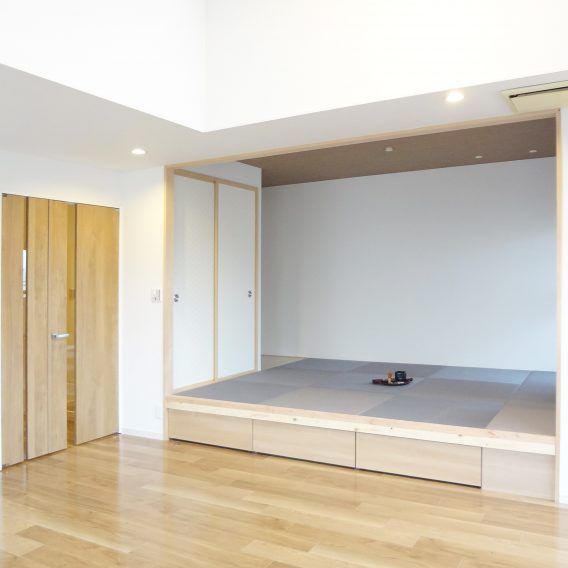 リビング横に和室があると、ご家族が集まった際にも、少しごろりと横になったり、お子さんを遊ばせたり、または洗濯物を畳んだりと、何かと使い勝手の良いスペースになります。畳下は収納スペースに…