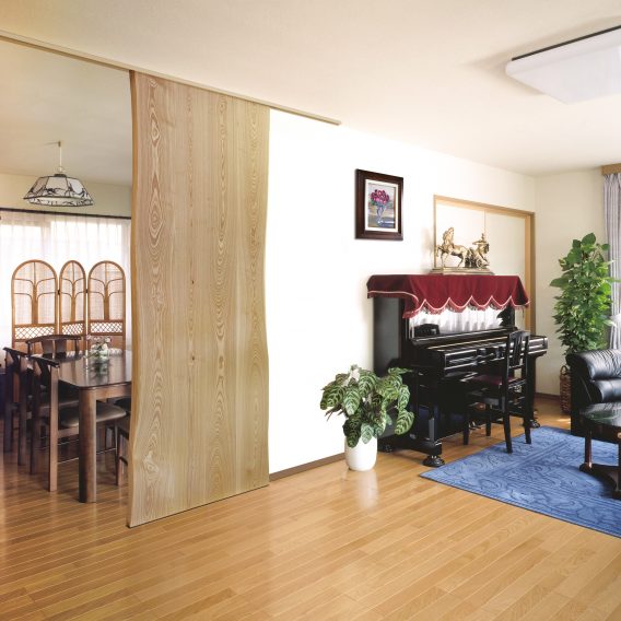家具の街でもある飛騨高山。ダイニングテーブルなどで使用される耳付きのテーブルを建具にアレンジしました。