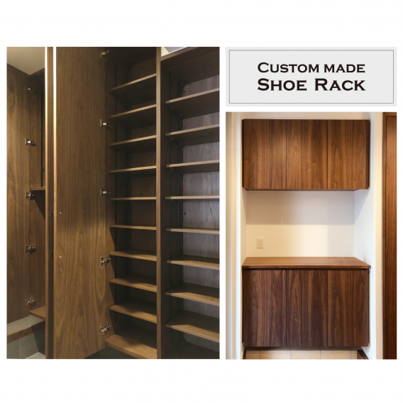 内装ドアに突板のドアをお考えでしたら、同じ突板を使って玄関収納も製作致します。玄関から高級感を感じられる空間となります。