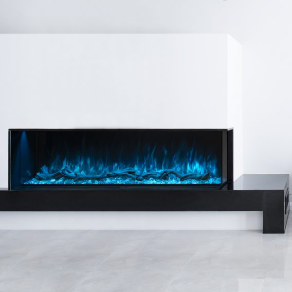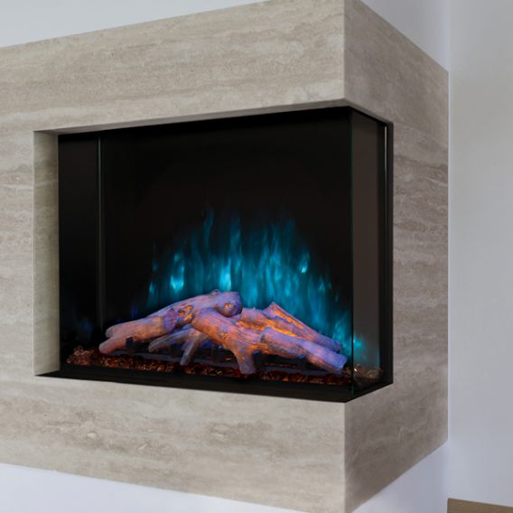 電気暖炉本体の側面がクリアガラスタイプにもできるため、前面と側面の様々な角度で炎をお楽しみ頂けます。炎の色、ダウンライトの色、薪下側ライトの色の変化により、炎をより美しく複雑に表現します。