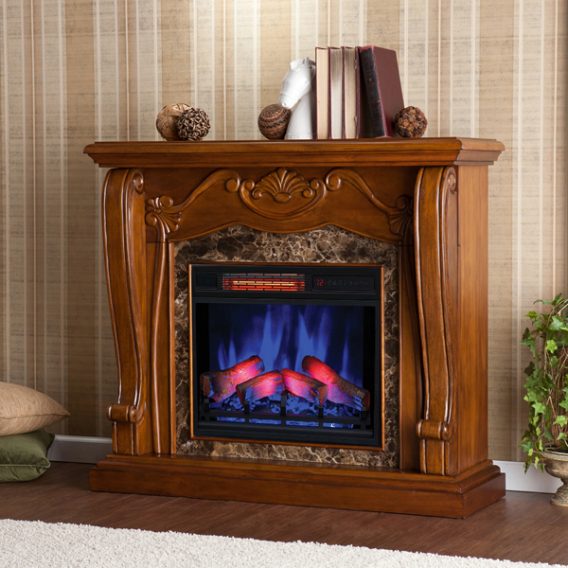 電気暖炉に遠赤外線ヒーターが内臓されておりますので、お部屋の湿度を奪わず暖まります。マントルピース暖炉棚カルドナは優雅なビクトリア調のデザインのウォールナット仕上げとブラウンマーブルの組み合わせです。