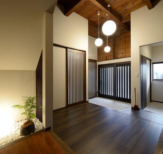 根太天井はそのままに新しい照明を取り付け、床をタイル貼りにリフレッシュ。格子後ろには階段下を利用した坪庭を新設しました。