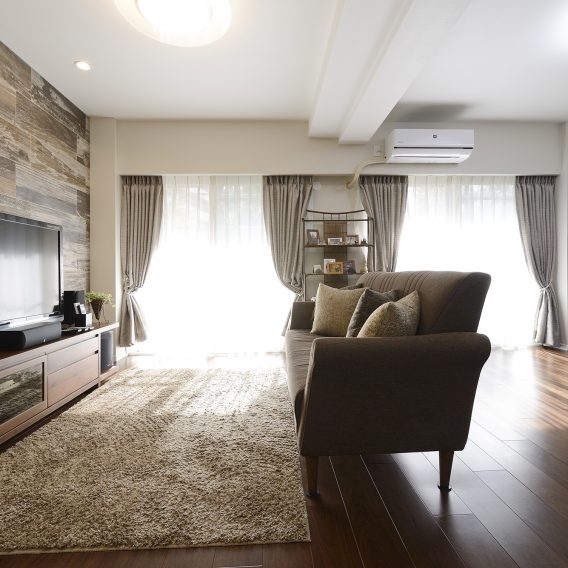 フロアやファブリックも温かみのあるやさしい感触のものを選択。カーテンまわりもレール部分が隠れるように。大人のセンスでまとめた上質なインテリアです。