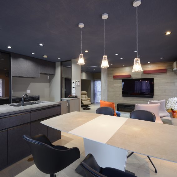 デザインタイルの壁面に、ダウンライトとブラケット照明で格調高い空間に。ダイニングは3連のペンダントライトがアクセントです。