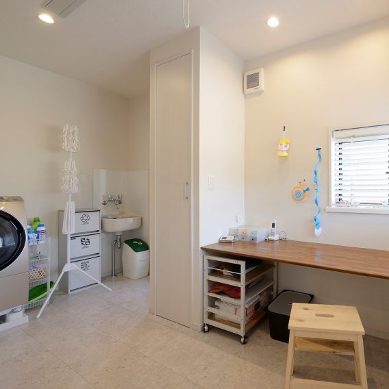 カウンター収納、洗濯機スペース、室内物干し、正面に作業台兼デスクを設置しました。