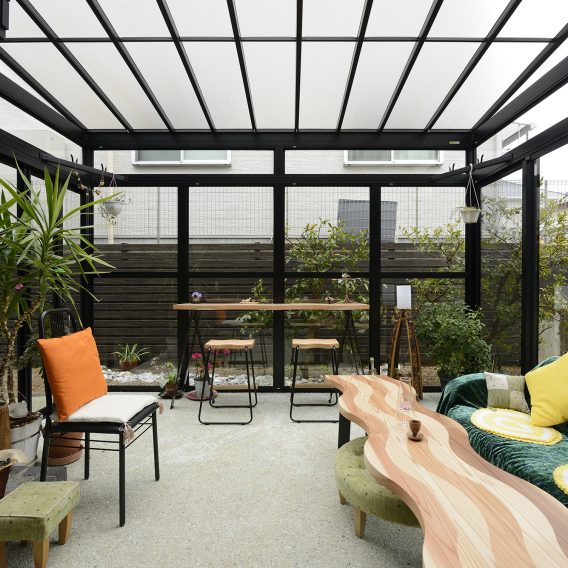 明るく開放的なサンルームは、おしゃれなソファや波型のテーブル、カウンターやスツールを置いたこだわりのおもてなし空間となりました。