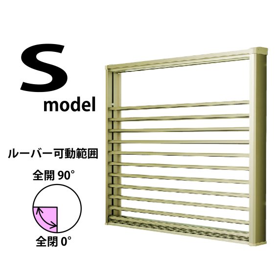 Sモデルは、室内側のロープで操作する手動タイプでルーバーの角度を0°~90°の範囲で自由に調整できます。腰窓専用のSモデルは、居室だけでなく、浴室の換気や目隠しに最適で庇があっても設置可能です。