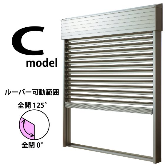 Cモデルは、電動タイプでルーバーの角度を0°~125°の範囲でどの位置でもルーバーの角度調整が自在におこなえます。2階に設置した場合でも、下からの視線を遮断しながら日光の取り込みができます。