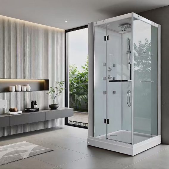 オーバーヘッドシャワー、ハンドシャワー、ボディーシャワーを標準搭載し、強化ガラスは飛散防止フィルム貼りで二重の安全対策を施しています。