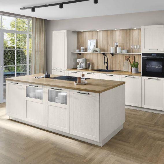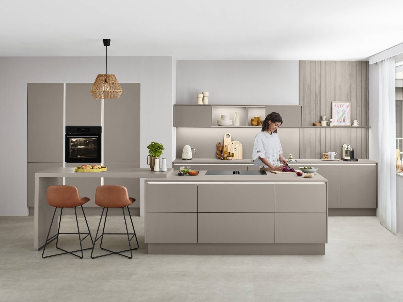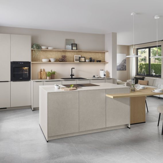 柔らかなサンドカラーは空間に落ち着きをもたらし、扉表面の繊細な質感がキッチンに活気あるアクセントを加えます。