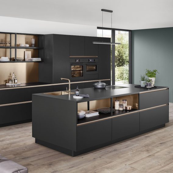 (プレミアムホーンドブラック)マットブラックとブロンズの要素がモダンな外観に理想的な調和を生み出すモデル496(プレミアムホーンドブラック)。埋込ハンドルや壁面パネルのブロンズメタリックが、洗練された空間をより上質に演出します。