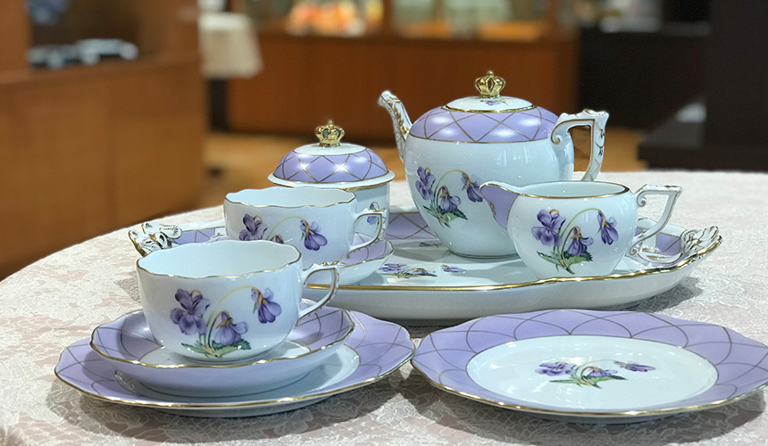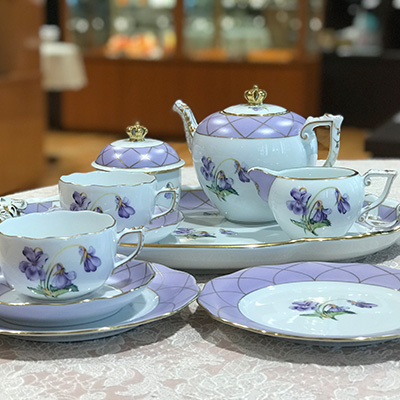 モチーフはエリザベートがこよなく愛したスミレの花が描かれ、ポット、シュガーのつまみはそれぞれゴールドの王冠で飾られています。