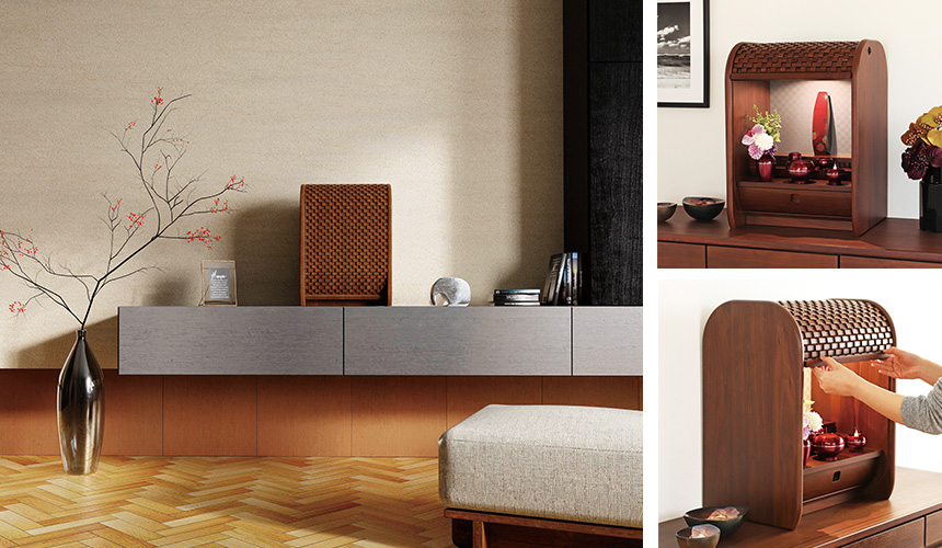 無垢材を組み合わせた巻き戸と、軽やかな脚部が目を惹くスタイリッシュな仏壇。