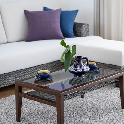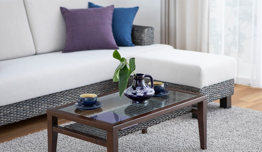 ソファと同素材のグレーのヒヤシンスとガラスの組み合わせが、落ち着きを感じさせるローテーブル