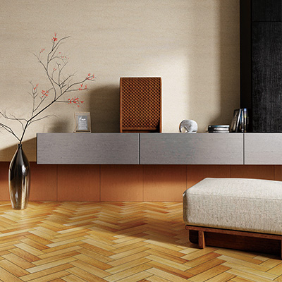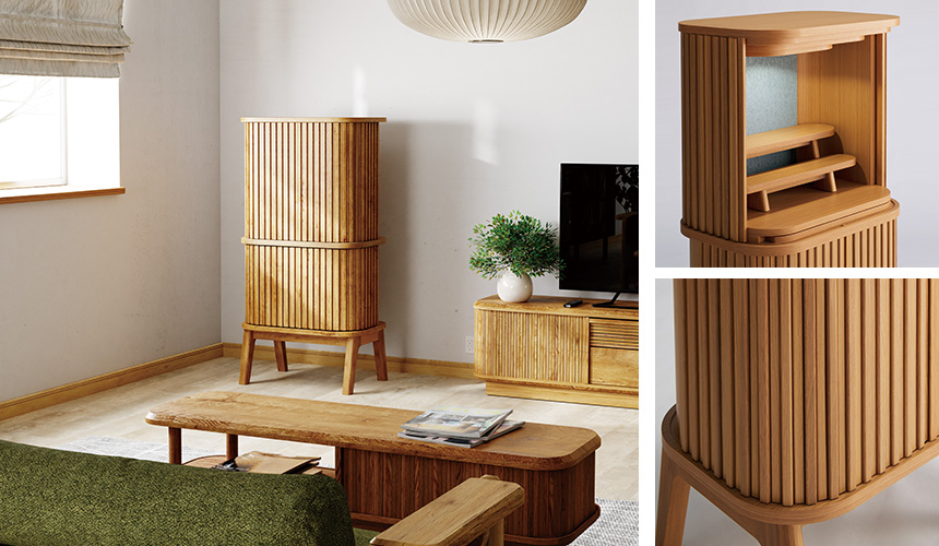 メープル、ナラ、カエデなど 10 種類の無垢材を組み合せた巻戸がモダンな仏壇。天然木の色彩がインテリアに溶け込みながら部屋を明るく演出し、特別な存在感を放ちます。巻戸を上にスライドすると模様が内部に回り込み、本尊スペースを彩る背板に早変わり。開閉するたびに熟練職人の手仕事によるクラフト感が味わえます。