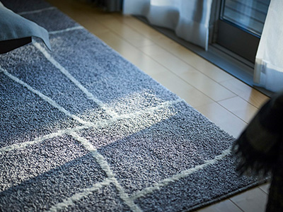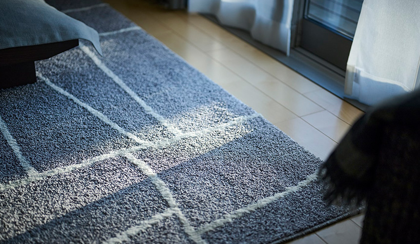 手描きのようなやさしいラインが穏やかな気持ちにさせるラグ コルダ。テーブルの脚の跡もつきにくい。