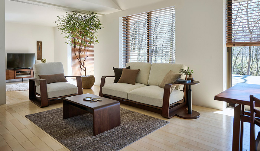 高さを抑えたロースタイルのソファは圧迫感が少なく、自然と目線が奥へと広がります。