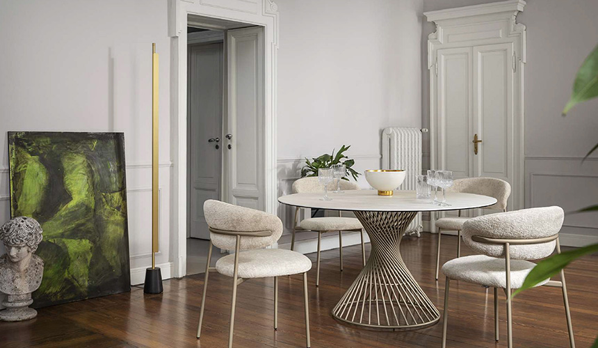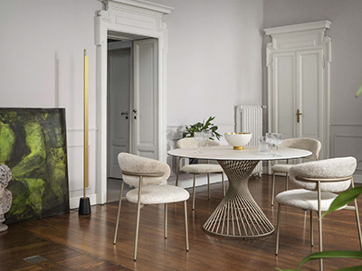 シンプルなデザインの中に、2024年のミラノサローネでも注目度の高かった新色「パールベージュ」や人気の「ブークレ生地」をミックスして上質な空間を演出。